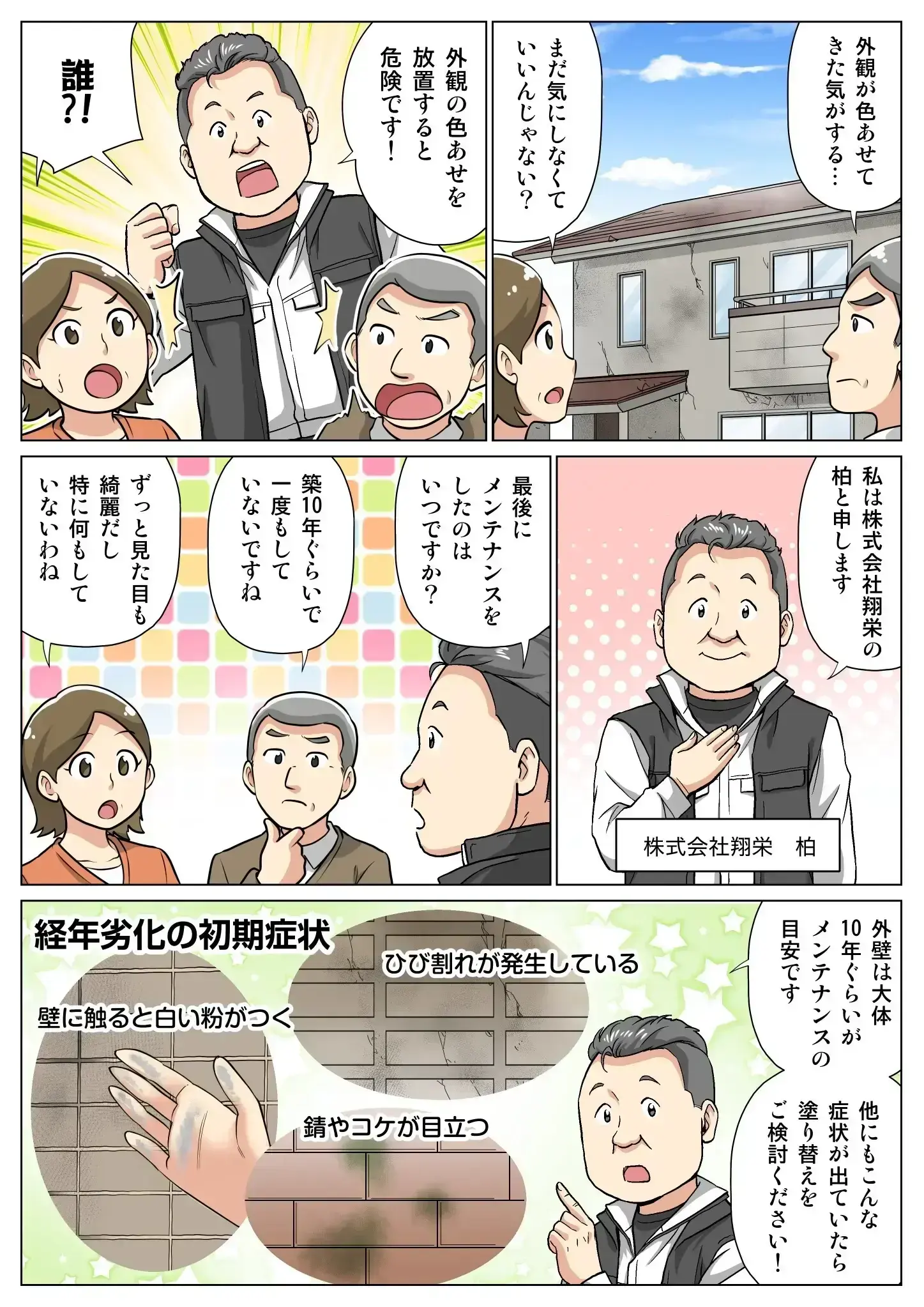 建物の雰囲気を一新できる外壁塗装。弊社では、旧塗膜の吹き付け柄、サイディングの模様を活かした塗装工事が可能です。ご要望や素材に合わせて最適な塗料をご提案いたします。