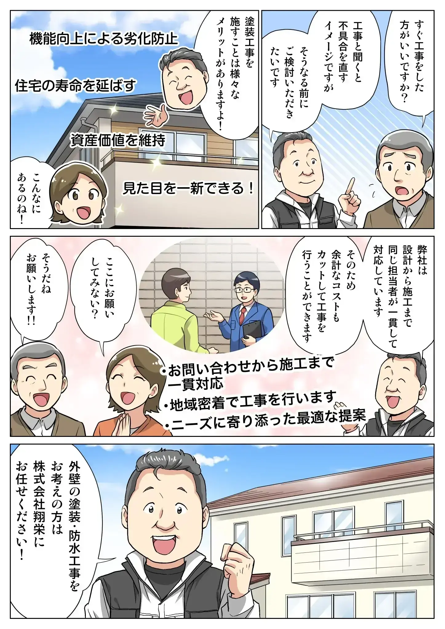塗装は、建物を美しくするだけのものではありません。紫外線や雨風から建物を保護し、大切な財産や暮らしを守るための役目もあります。弊社では、外壁・屋根の塗装から防水工事まで対応可能。安全で快適な暮らしのために、質の高い施工をご提供いたします。